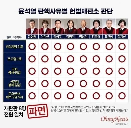 12.3 쿠데타 이후 길고 지루하게 진행되던 윤석열 탄핵심판결과가 드디어 나왔군요. 8:0 전원일치 파면! 사필귀정입니다. 내란 우두머리 윤석열은 물론이고 내란에 연루된 모든 자들, 그리고 명백히 헌법과 법률을 위반하며 내란을 두둔하고 방조해온 일부 관료와 정치인까지, 이번 내란사태와 관련된 모든 자들에게 엄히 책임을 물어야 할 것입니다. 그래서 지금까지 시민들이 피와 눈물로 지켜 온 민주 공화정을 총칼과 법 기술로 유린하려는 반민주 반헌법 세력이 다시는 고개를 쳐들 엄두도 내지 못하도록 준엄한 심판과 기억의 돌무더기를 쌓아야 하겠습니다.