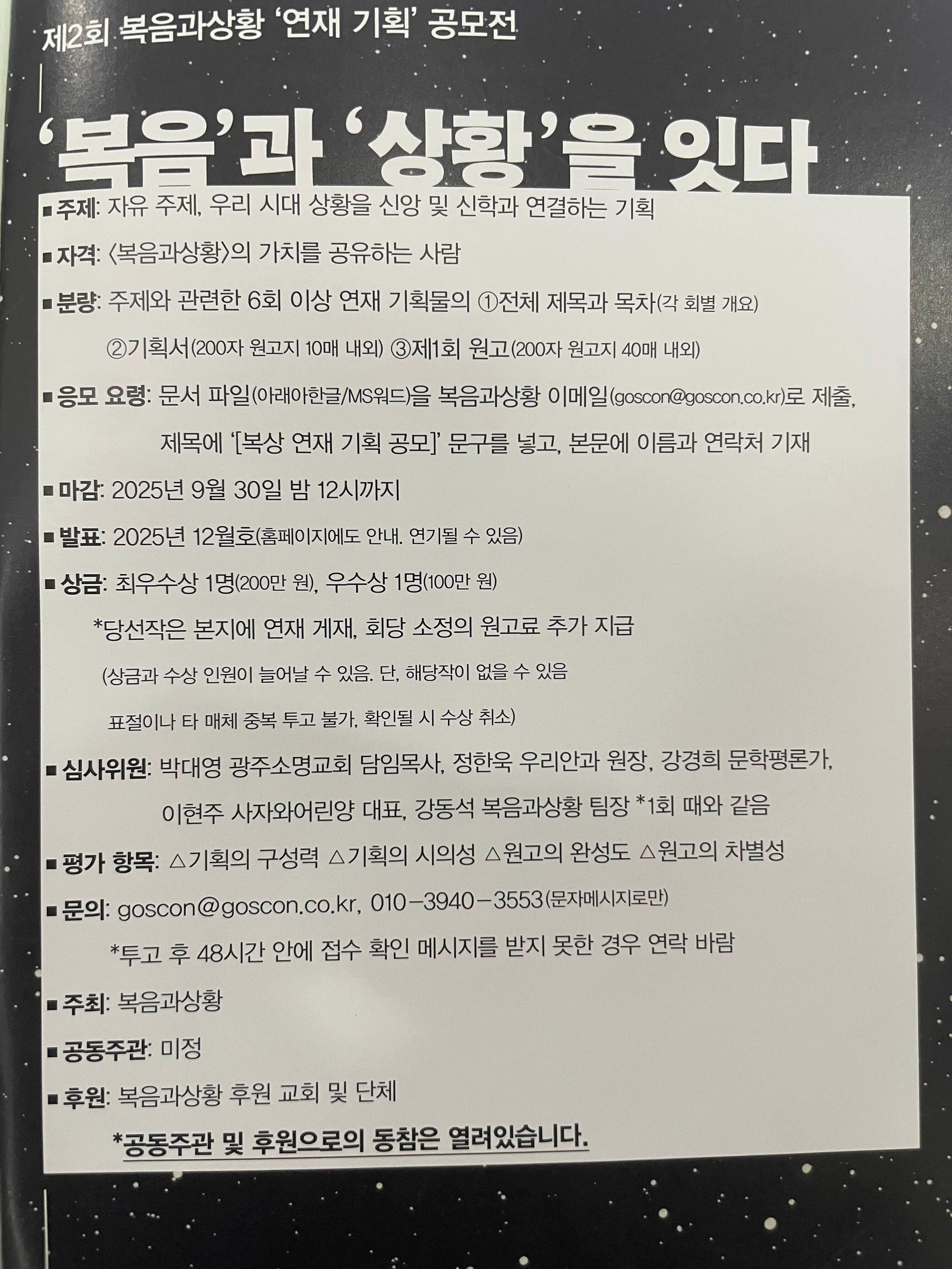 이번에 나온 <복음과 상황> 7월호에 "제2회 복음과상황 '연재 기획' 공모전 - '복음'과 '상황'을 잇다" 광고가 났네요. 주제는 '자유 주제로 우리 시대 상황을 신앙 및 신학과 연결시키는 기획'이고 9월30일이 마감일이라고 합니다. (사진 1,2) 작년에 참신한 기획으로 최우수상을 수상한 구선우 작가(목사님)는 2024년 10월호부터 지금까지 수상작인 "구선우의 동물기"를 연재 중이십니다. (사진 3,4) 저는 작년에 이어 올해도 심사위원으로 참여하게 되었습니다. 많이들 신청해 주세요!