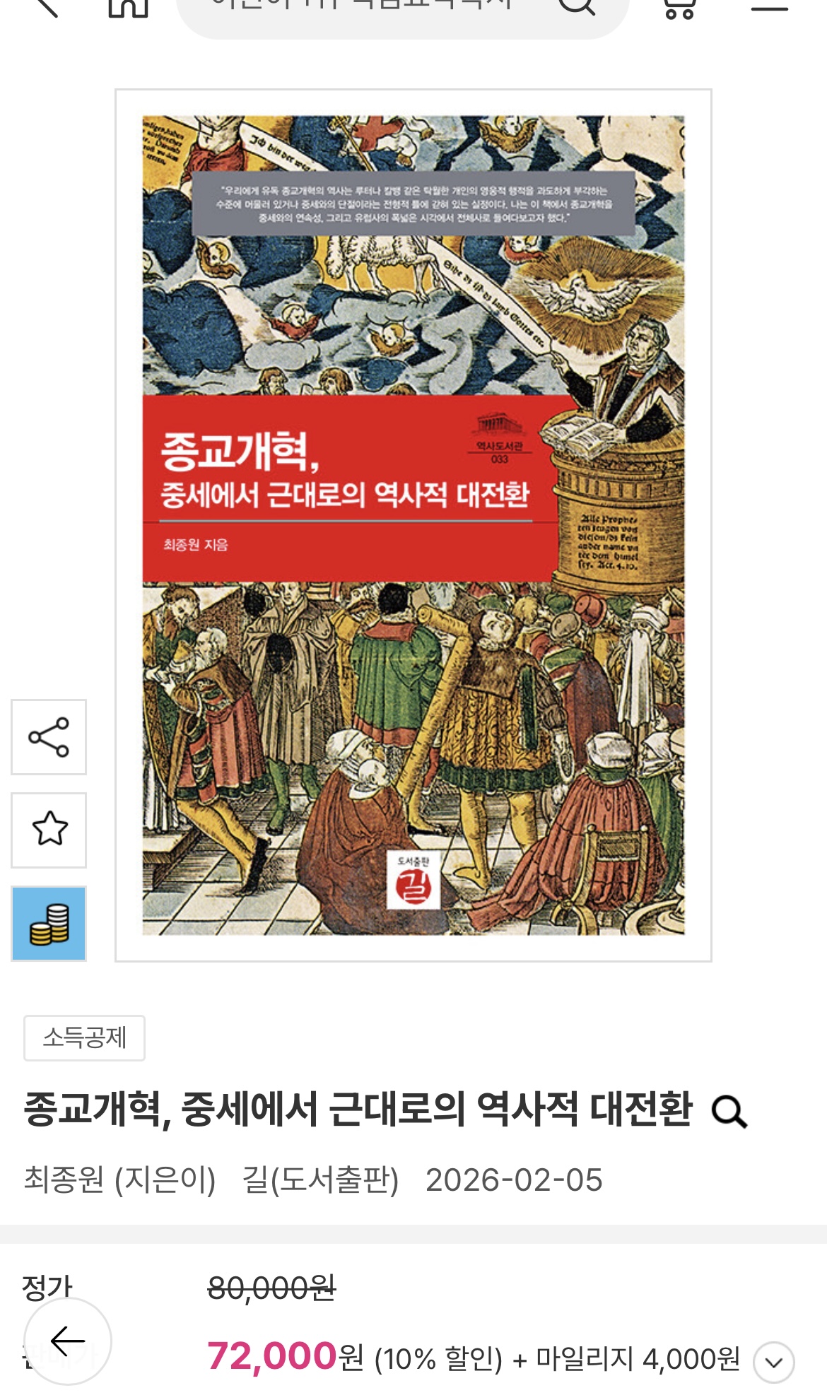 찰스 테일러의 『세속의 시대』 (조형준 옮김, 새물결 펴냄) 와 최종원 교수님의 『종교개혁, 중세에서 근대로의 역사적 대전환』 (도서출판 길 펴냄)이 요즘 페북 담벼락 여기저기서 자주 눈에 띱니다. 좋은 저자가 쓴 좋은 책들이라 탐이 납니다만 ..... 와우, 문제가 책값이네요! (사진 1, 2) 일단 보관함에 저장은 해 놓았습니다. 그런데 얼마 전 찾아보았던 나온지 오래된 얇디 얇은 성경공부 교제인 <예수 그리스도의 생애와 사역>이 중고가로 5-9만원이라 깜짝 놀랐었는데 그에 비하면 이 책들은 비싼 편도 아니라는 생각이 스멀스멀 ... 어이쿠, 정신 차려야겠습니다! ㅋㅋㅋ (사진 3-5)